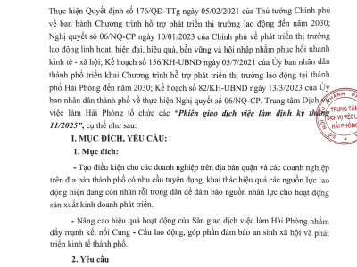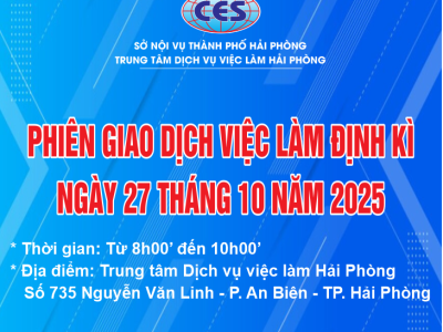 TUYỂN DỤNG LAO ĐỘNG MIỄN PHÍ : PHIÊN GIAO DỊCH VIỆC LÀM ĐỊNH KỲ NGÀY 27/10/2025 Tại 735 Nguyễn Văn Linh- An Biên - Hải Phòng Mọi chi tiết xin vui lòng liên hệ chúng tôi: Số 73