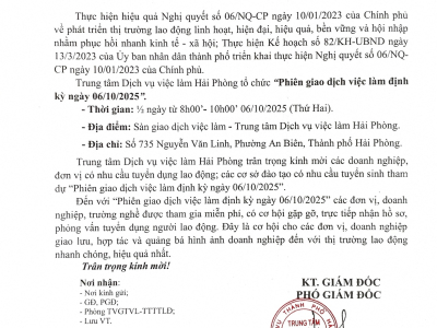 TUYỂN DỤNG LAO ĐỘNG MIỄN PHÍ : PHIÊN GIAO DỊCH VIỆC LÀM ĐỊNH KỲ NGÀY 13/10/2025 Tại 735 Nguyễn Văn Linh- An Biên - Hải Phòng Mọi chi tiết xin vui lòng liên hệ chúng tôi: Số 73