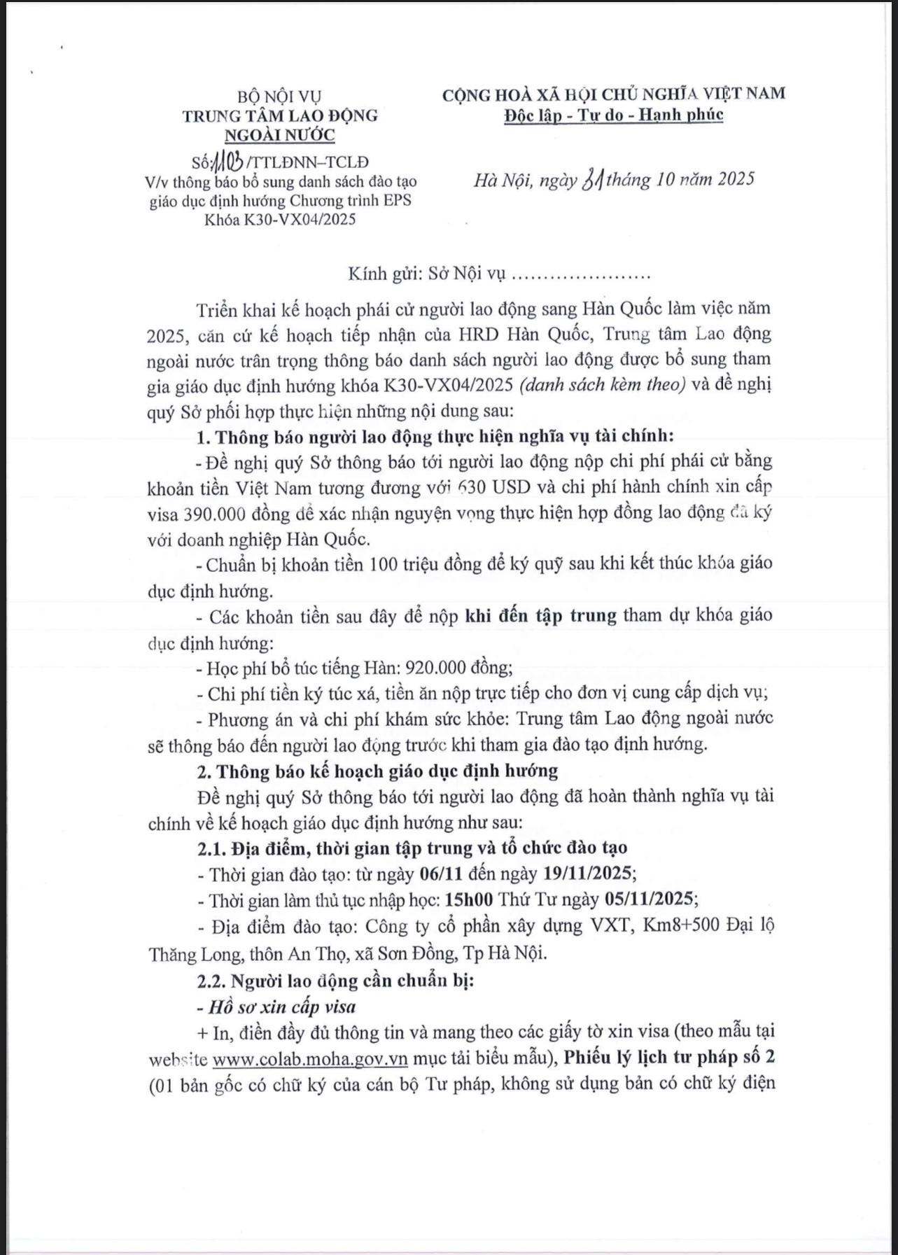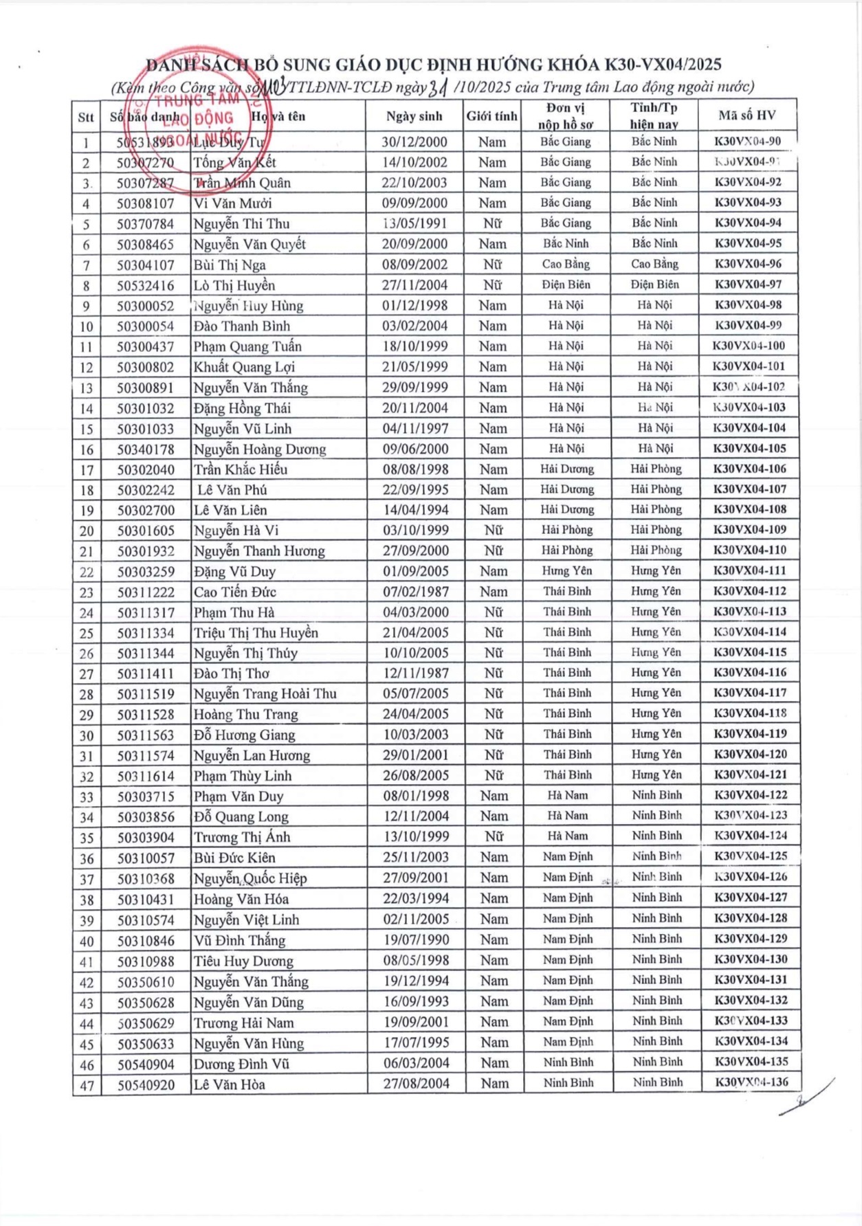 THÔNG BÁO BỔ SUNG DANH SÁCH ĐÀO TẠO GIÁO DỤC ĐỊNH HƯỚNG CHƯƠNG TRÌNH EPS KHÓA K30-VX04/2025 THEO CV SỐ 1103/TTLĐNN-TCLĐ