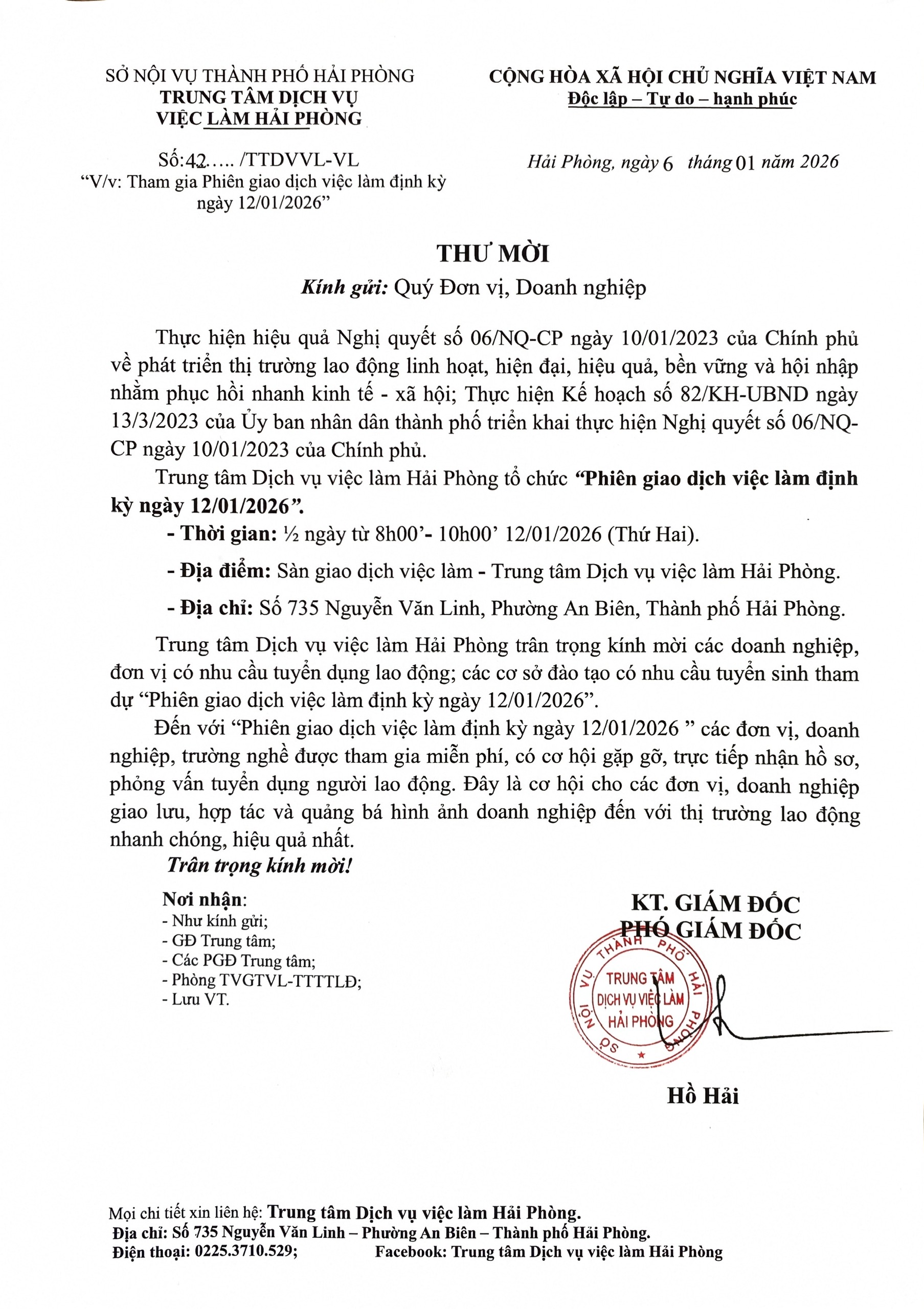 Nhằm kết nối hiệu quả Cung - Cầu lao động, hỗ trợ doanh nghiệp, đơn vị tìm kiếm nguồn nhân lực chất lượng và giúp người lao động tìm được việc làm phù hợp, Trung tâm Dịch vụ việc làm Hải Phòng trân trọng kính mời Quý Doanh nghiệp trên địa bàn thành phố đăng ký tham gia Phiên giao dịch định kì tại Trung Tâm
