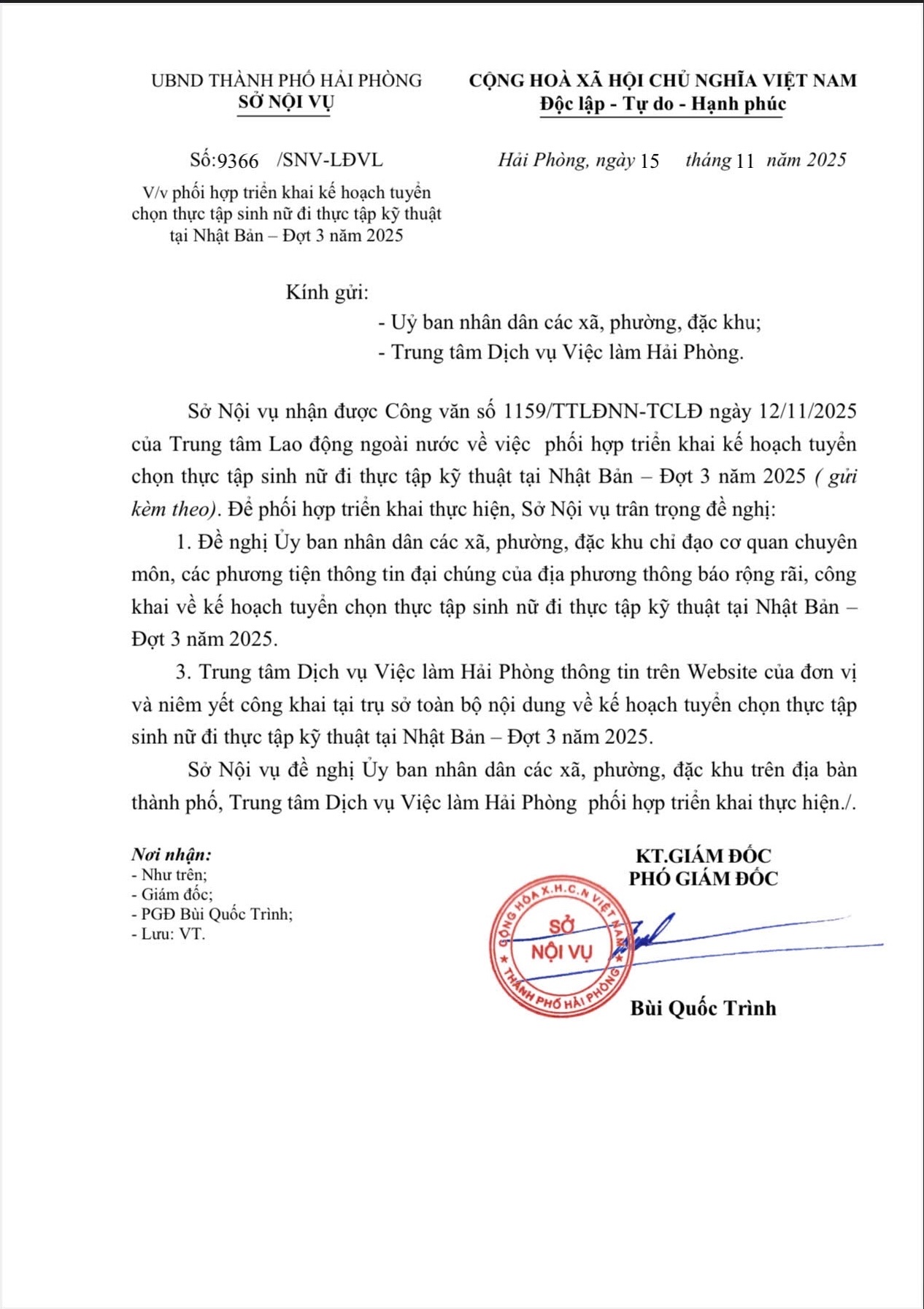 THÔNG BÁO VỀ VIỆC PHỐI HỢP TRIỂN KHAI KẾ HOẠCH TUYỂN CHỌN THỰC TẬP SINH NỮ ĐI THỰC TẬP KĨ THUẬT TẠI NHẬT BẢN - ĐỢT 3 NĂM 2025 THEO CV SỐ 9366/SVN-LĐVL