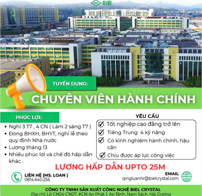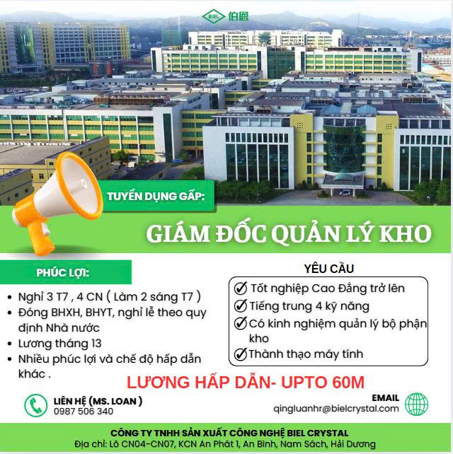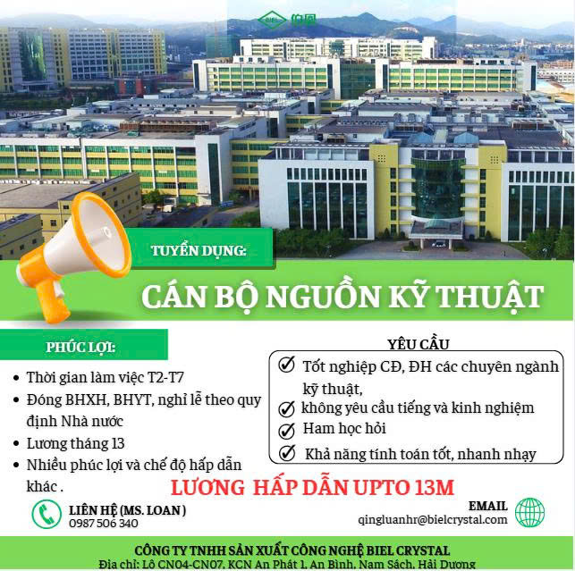 TUYỂN DỤNG - CÔNG TY TNHH SẢN XUẤT CÔNG NGHỆ BIEL CRYSTAL